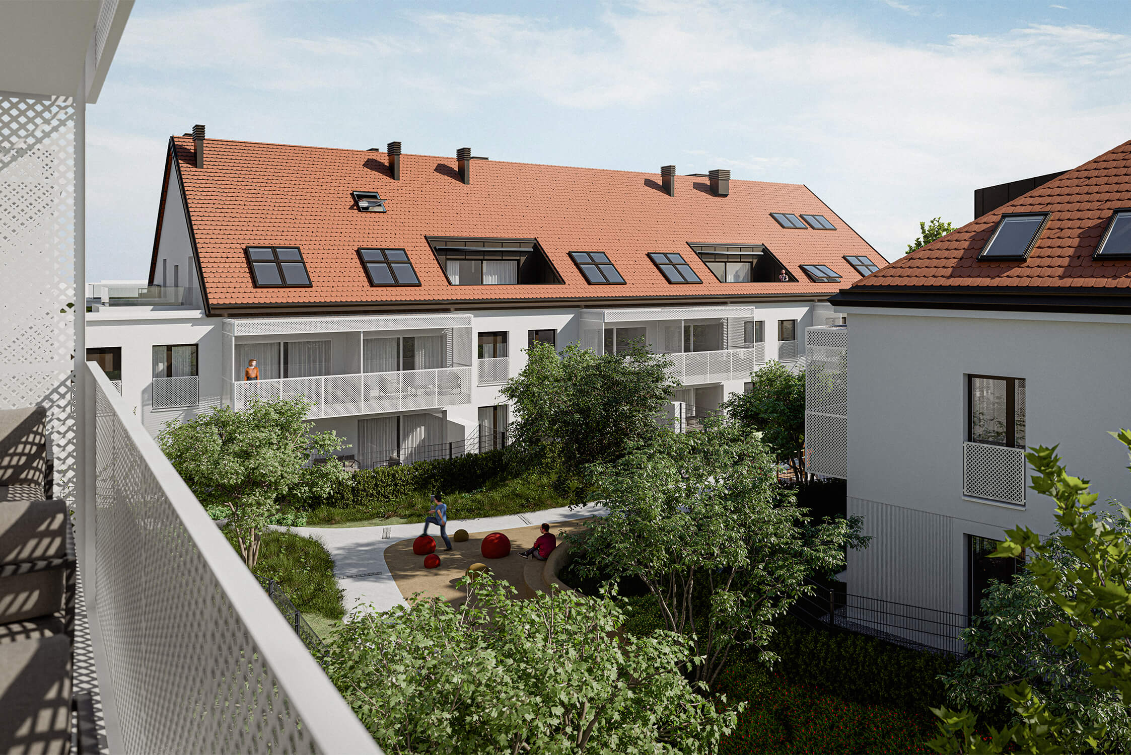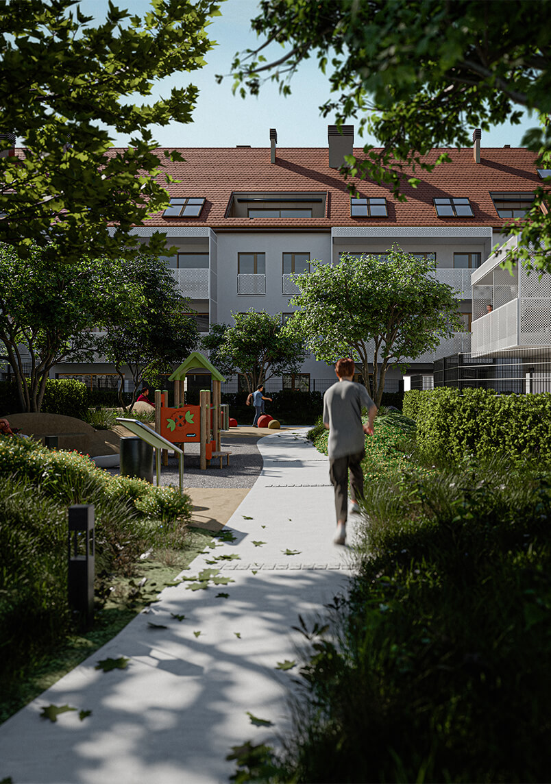 Med grajenimi strukturami se oblikuje osrednji javni prostor z zelenimi in utrjenimi površinami. Do njega vodi več dostopov: na severozahodu in jugu s Parmove ulice ter na severovzhodu skozi pasažo objekta s ploščadi Knafličevega prehoda. Ob tlakovanih pešpoteh so nanizani skupni prostori za druženje in površine za igro s tipskimi igrali. Osrednji del je višinsko moduliran v valovito površino za igro najmlajših. Celotna ureditev se nahaja nad kletjo, zato je za saditev višje drevnine potrebno dodatno nasutje, ki se izvede lokalno ob poteh. Prostor bo zasajen z grmičjem in nižjimi drevesi.