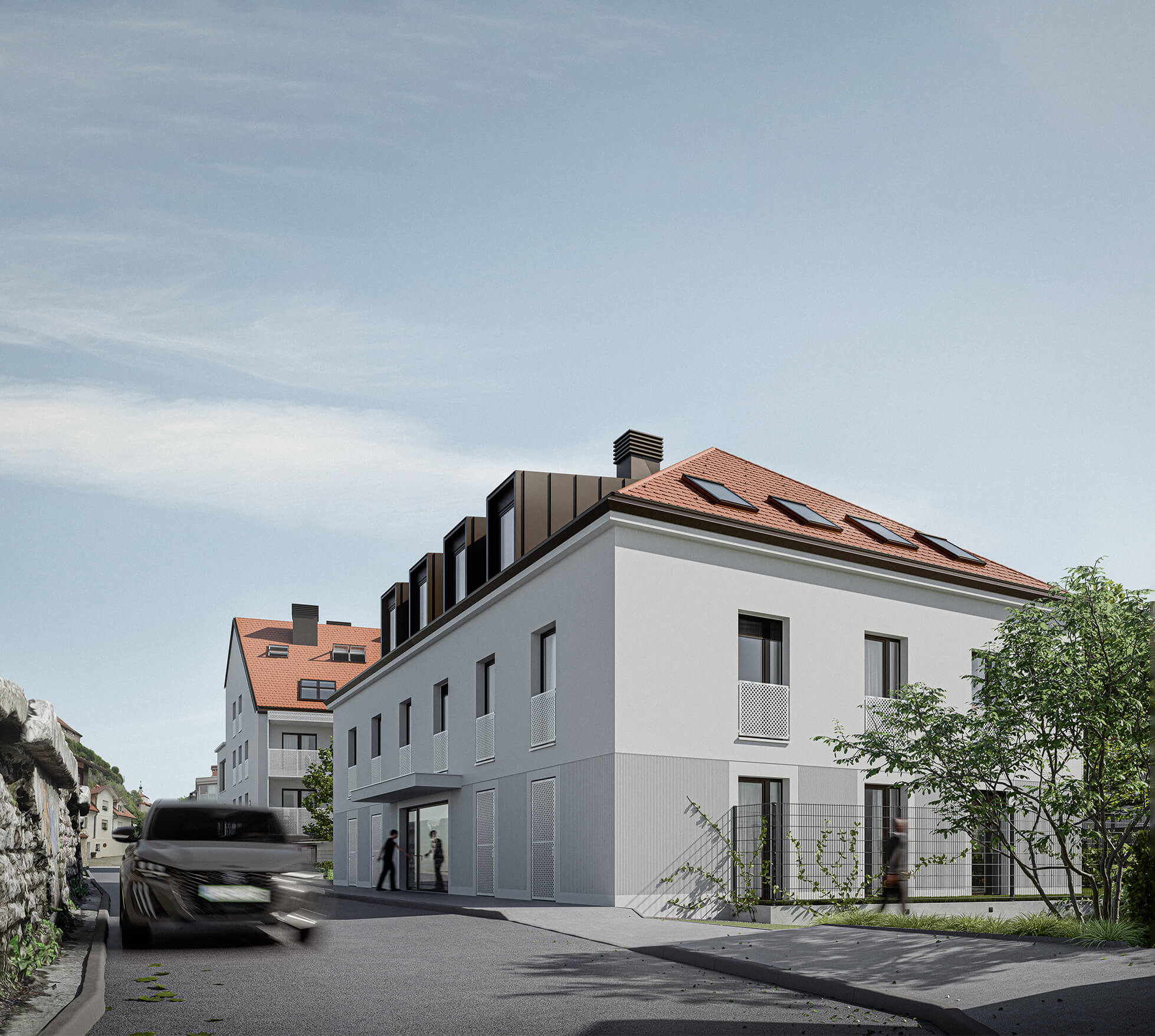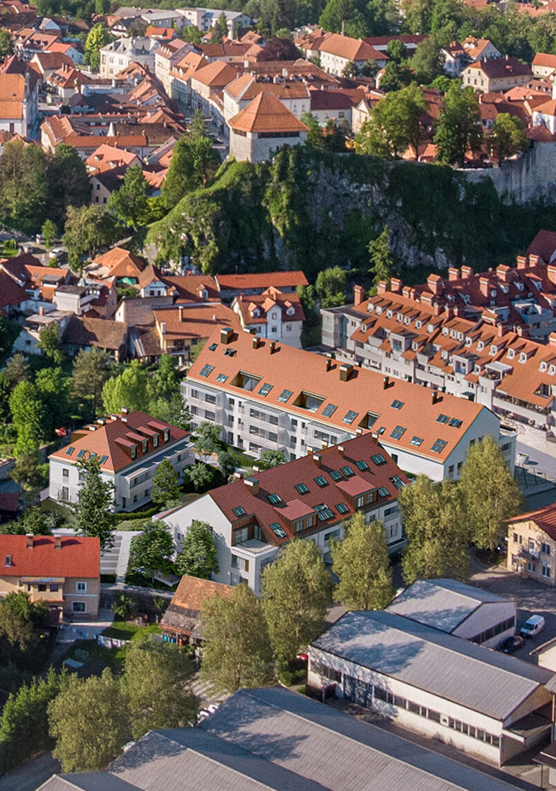 Skladno z načrtovano urbanistično ureditvijo je ob Usnjarski cesti predviden objekt, ki se v obliki črke L nadaljuje vzdolž Knafličevega prehoda. Lameli se višinsko razlikujeta. Na strani Knafličevega prehoda je objekt etažnosti 2K+P+2N+2M, na strani Usnjarske ceste pa je nižji (2K+P+N+2M), z namenom ohranjanja mestne vedute Kamnika. Streha je dvokapna, na stiku obeh lamel pa prekinjena s segmentom ravne strehe, kar ustvarja dodatno vedutno okno. Na severozahodu območja je predvidena vila s štirikapno streho, etažnosti 2K+P+N+M. Strehe so krite z opečno kritino. Objekta v podzemnem delu povezuje skupna kletna garaža.