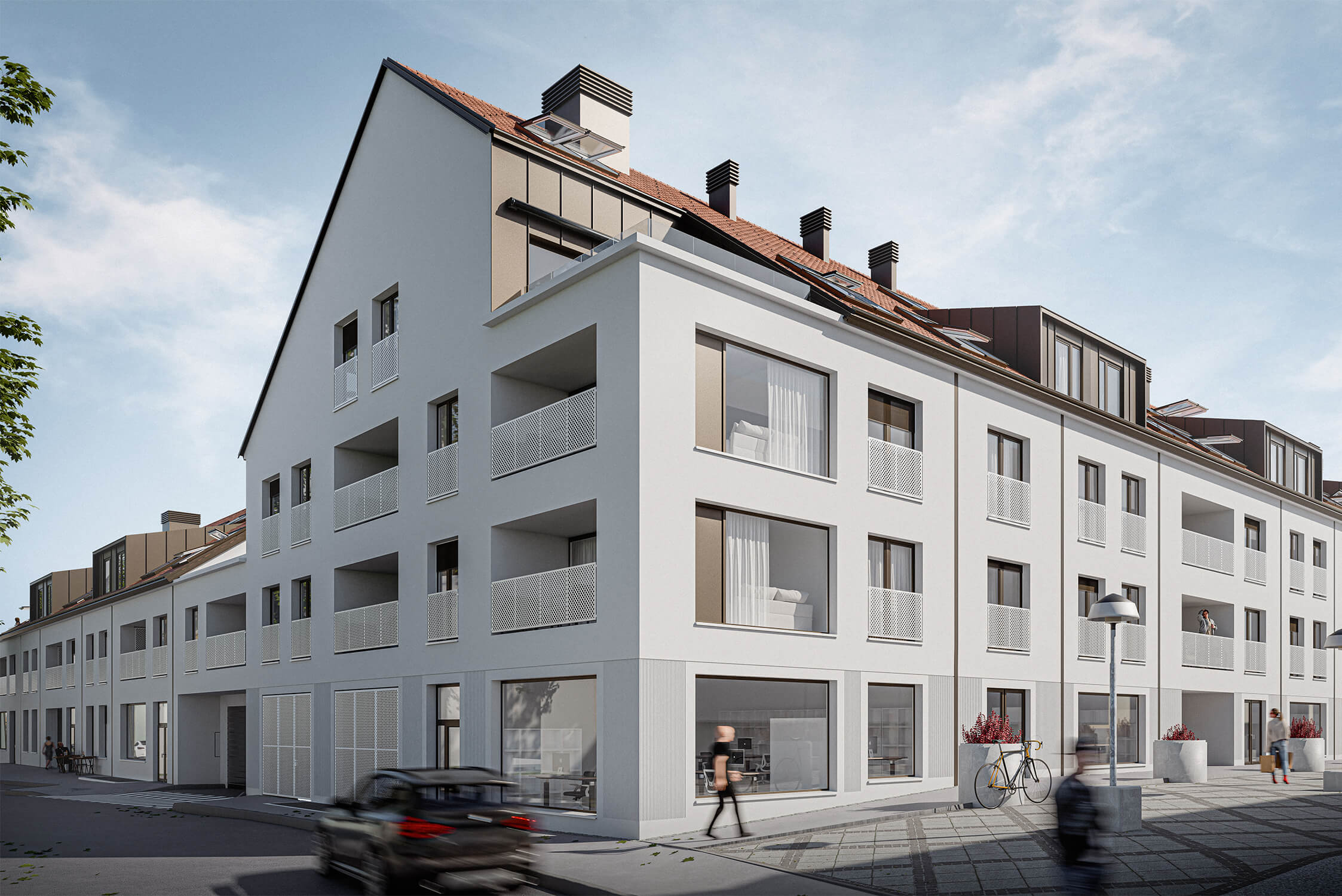 Fasado večjega objekta oblikuje kontinuiran enovit ovoj. Na javno izpostavljenih jugovzhodni in severovzhodni fasadi so predvidene poglobitve v obliki lož, na bolj zasebnih severozahodni in jugozahodni strani pa obešeni globoki balkoni. Bivalni prostori pritličnih atrijskih stanovanj se nadaljujejo v zunanje terase. Stanovanja so osvetljena z večjimi okenskimi odprtinami brez parapetov in so obojestransko nanizana ob osrednjem povezovalnem hodniku.