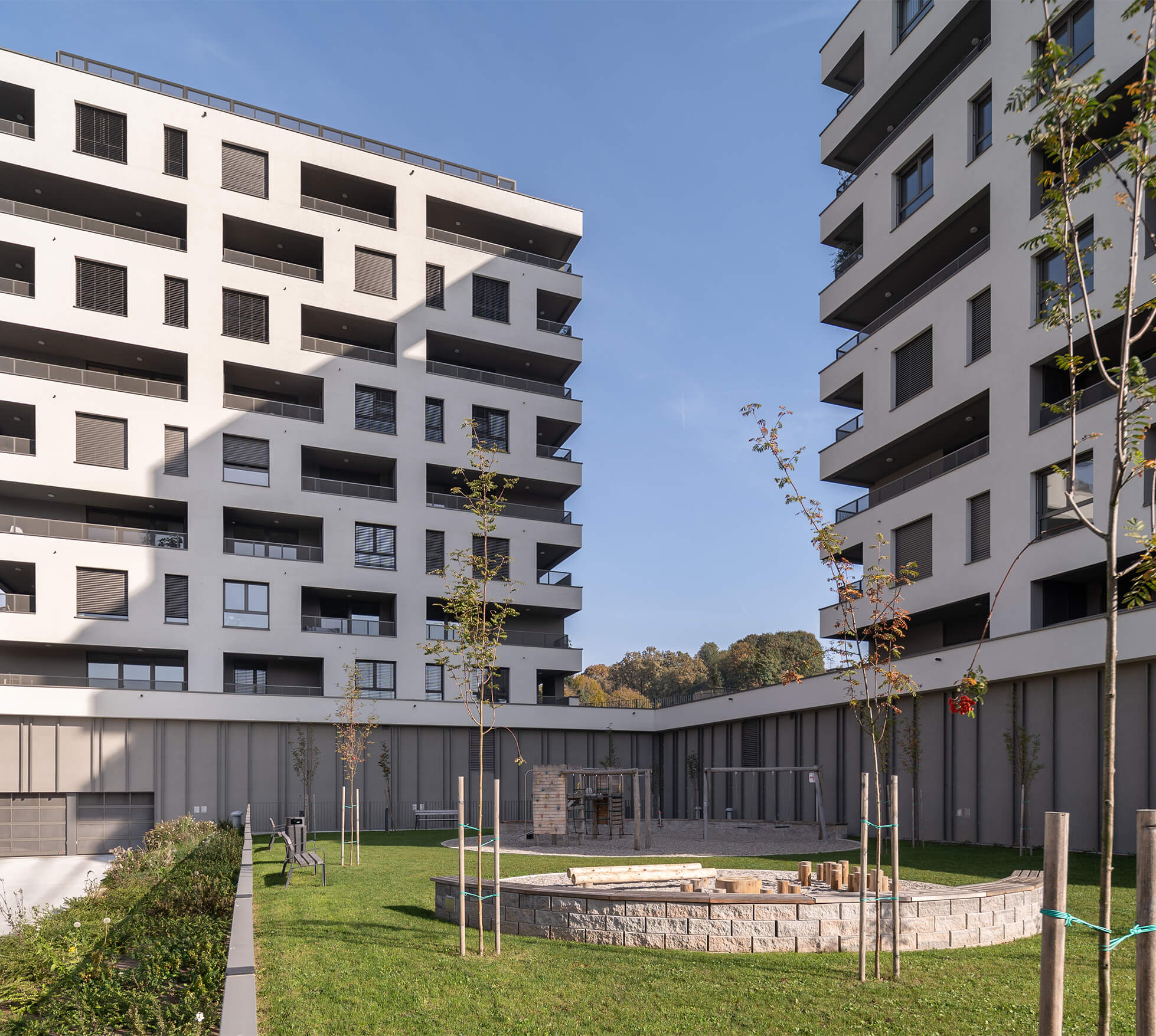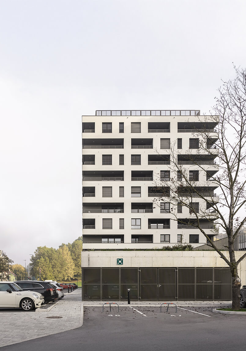 V obeh stolpnicah skupaj je umeščeno 94 različno velikih stanovanjskih enot in skupni prostor za druženje stanovalcev. Odprta in zračna lokacija objekta ponuja kvalitetne razglede na vse strani neba. Temu sledijo različne orientacije stanovanj, kar prispeva k občutku zasebnosti. Bivalni prostori stanovanj se preko velikih lož podaljšujejo v zunanji prostor. Stanovanja sestojijo iz odprtih svetlih prostorov, konstrukcijska zasnova pa omogoča njihovo kasnejše prilagajanje skozi spreminjajoče se potrebe prebivalcev.