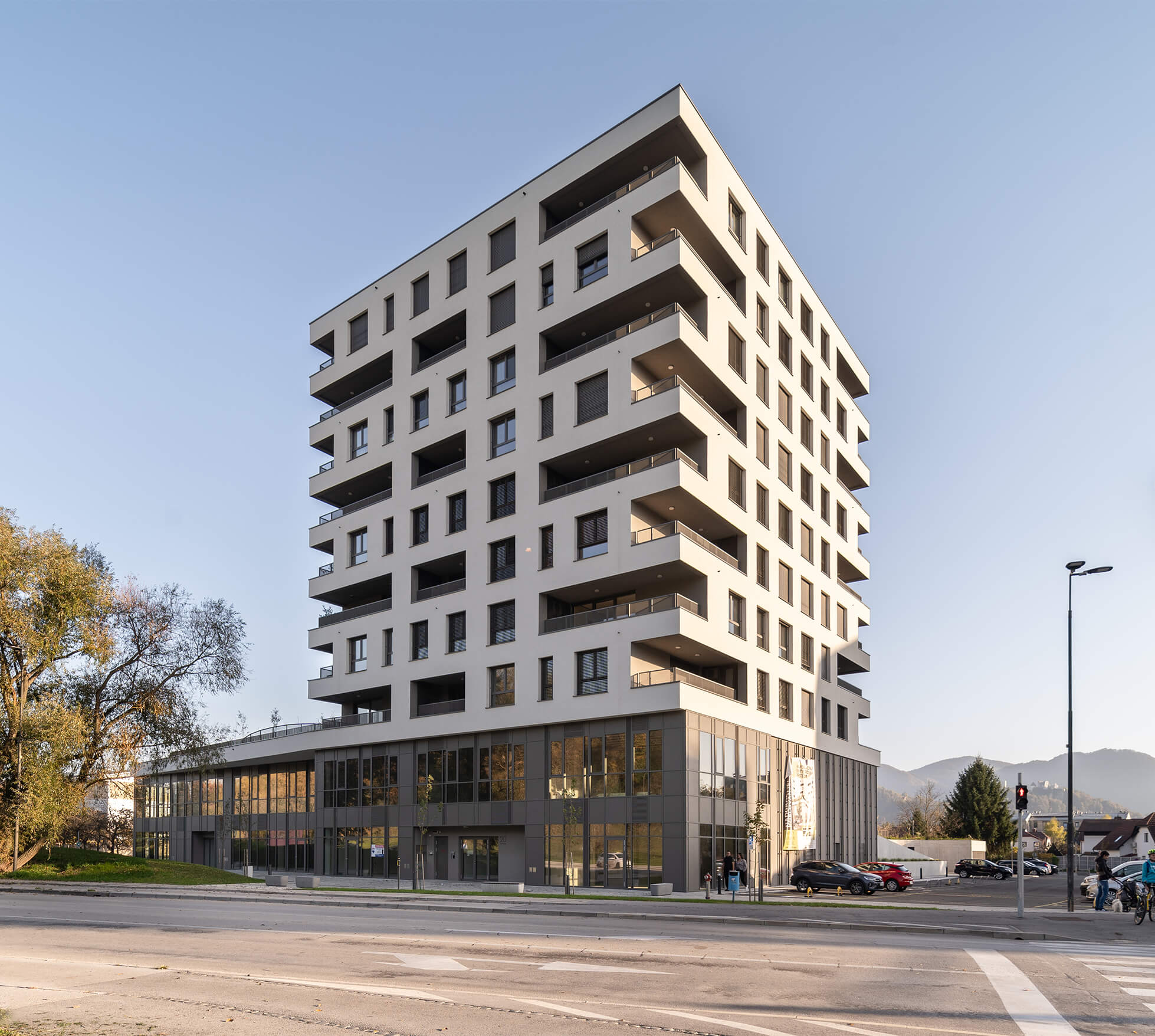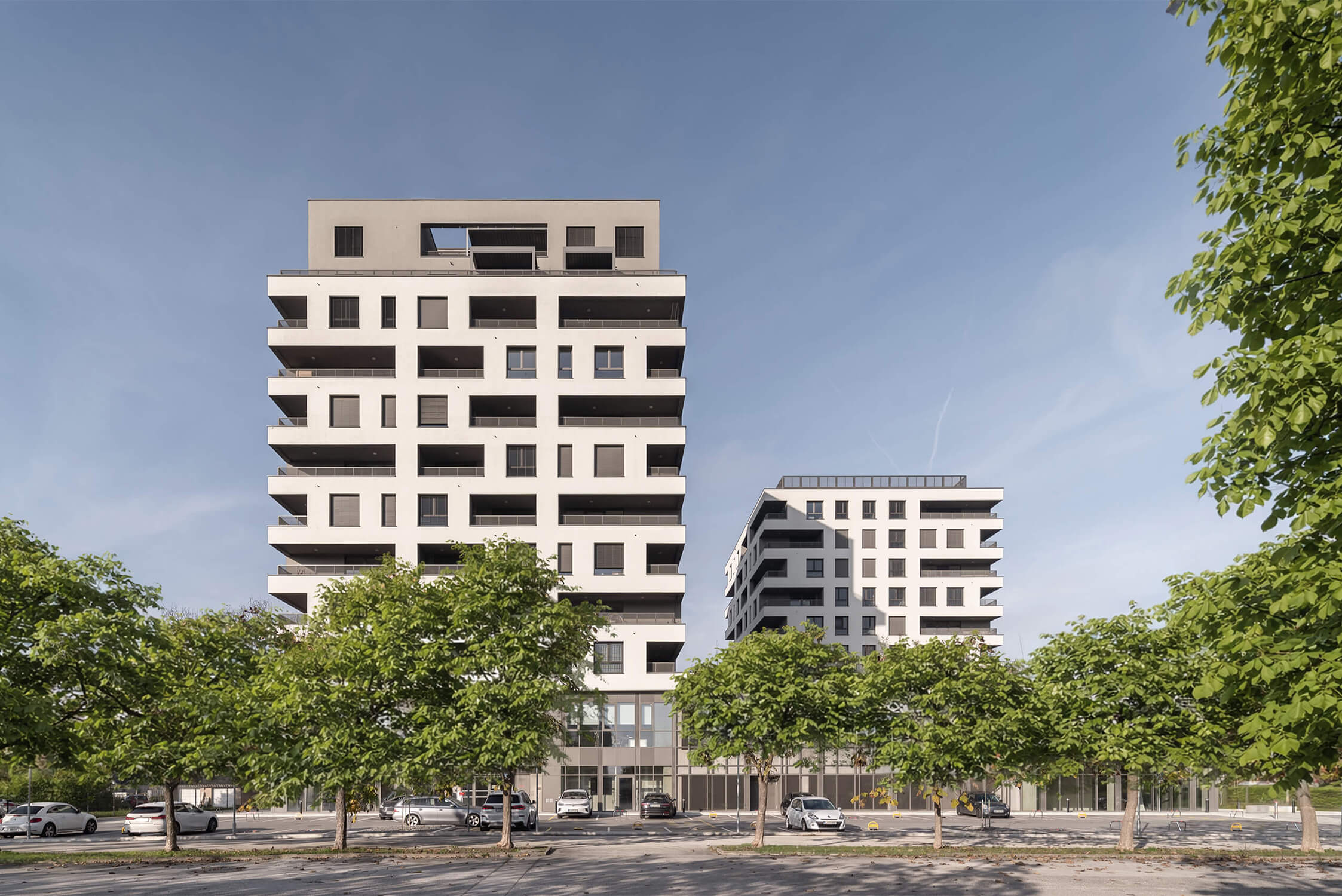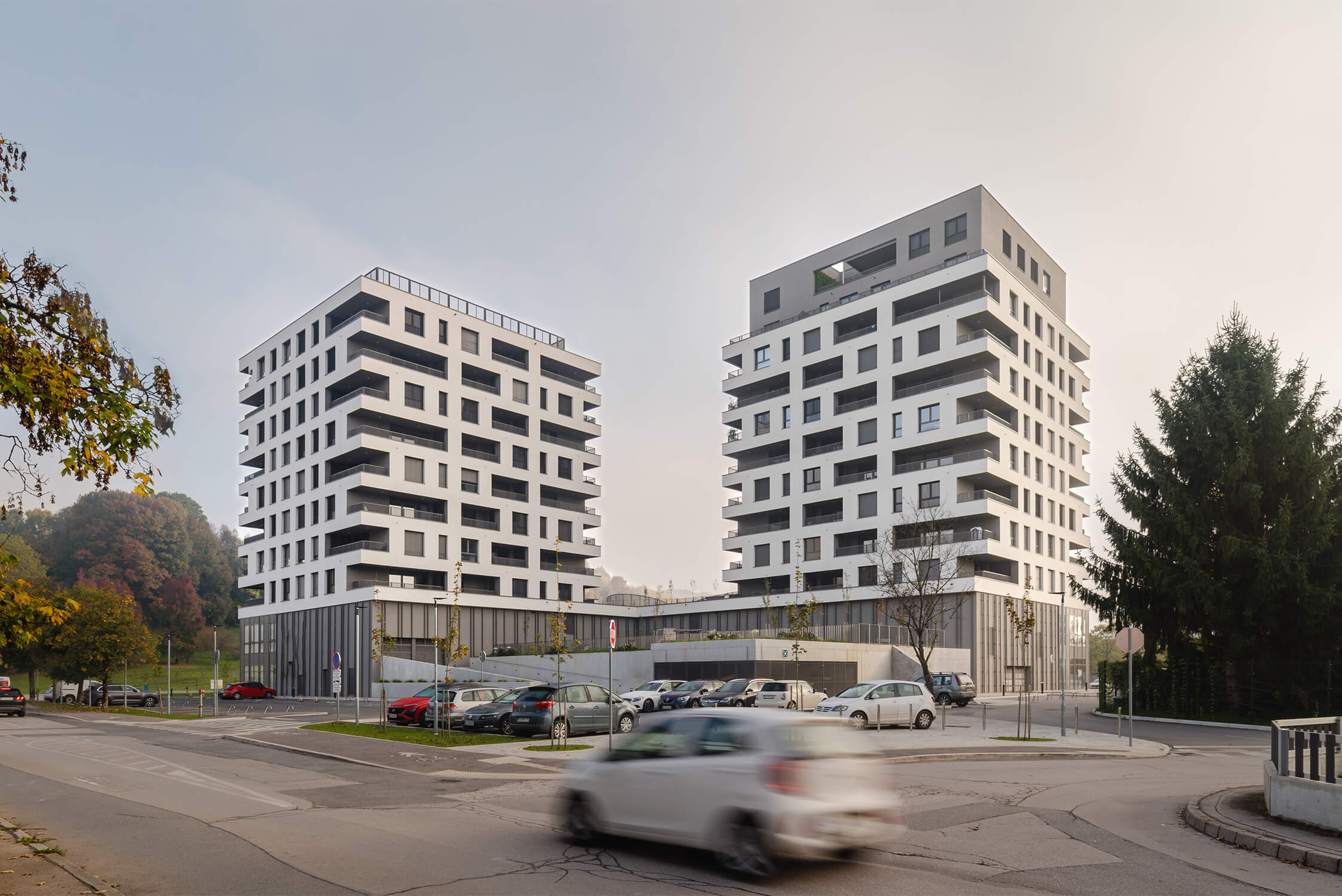 Objekt sestavljata dva stanovanjska stolpiča, ki se dvigata nad dvoetažnim podstavkom z javnim programom in parkirišči. Stolpiča višine osem in deset etaž predstavljata nadaljevanje urbanističnega vzorca stolpnic na zahodu. Kompozicija podstavka v obliki črke L na eni strani ustvari mirni zaledni del, na drugi strani se preko fasade mestnega značaja navezuje na javne površine.