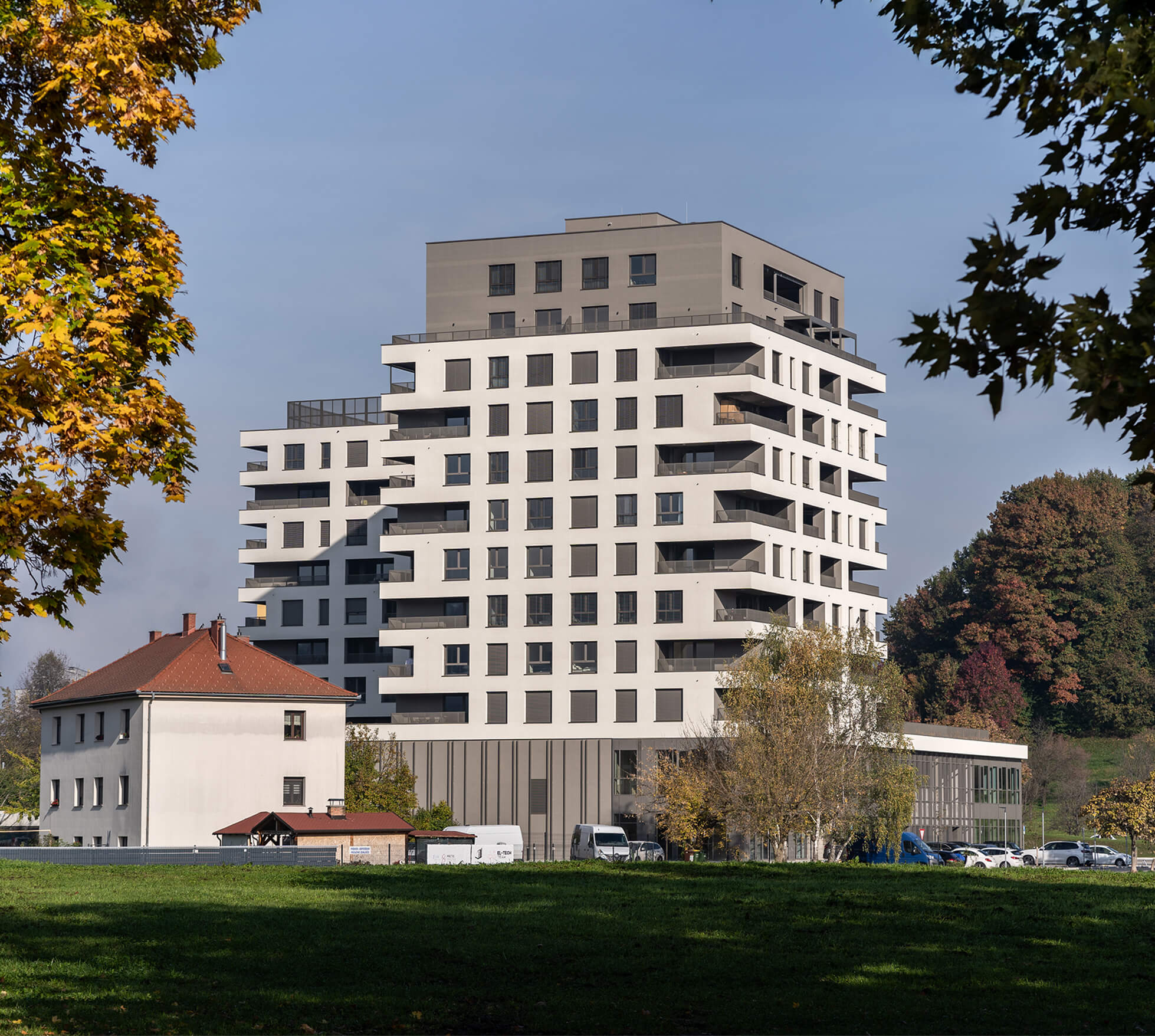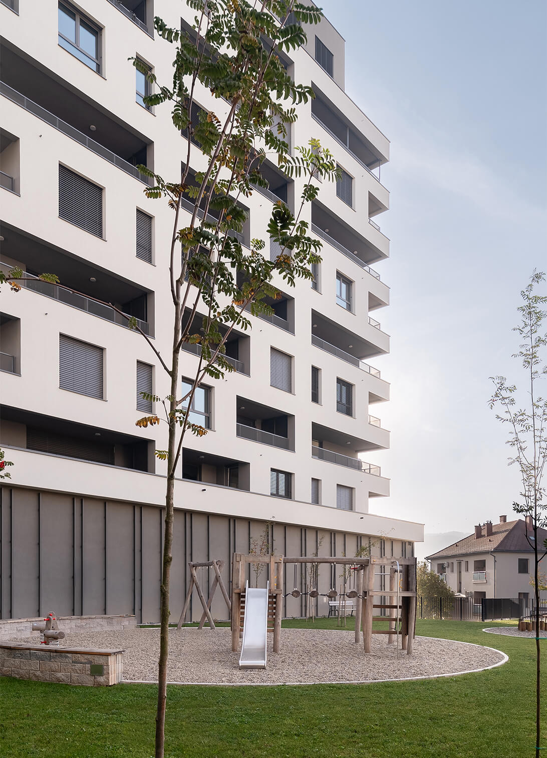 Kompozicija kompleksa s severne in vzhodne strani objema obstoječe pol-vkopano zaklonišče. Njegova zelena streha, ki je nad nivojem prometnih površin, služi kot varen in miren prostor za druženje in igro otrok. Prav tako se urejene parkovne površine nahajajo na pohodni strehi poslovno-parkirnega dela in predstavljajo zunanji prostor za druženje stanovalcev.